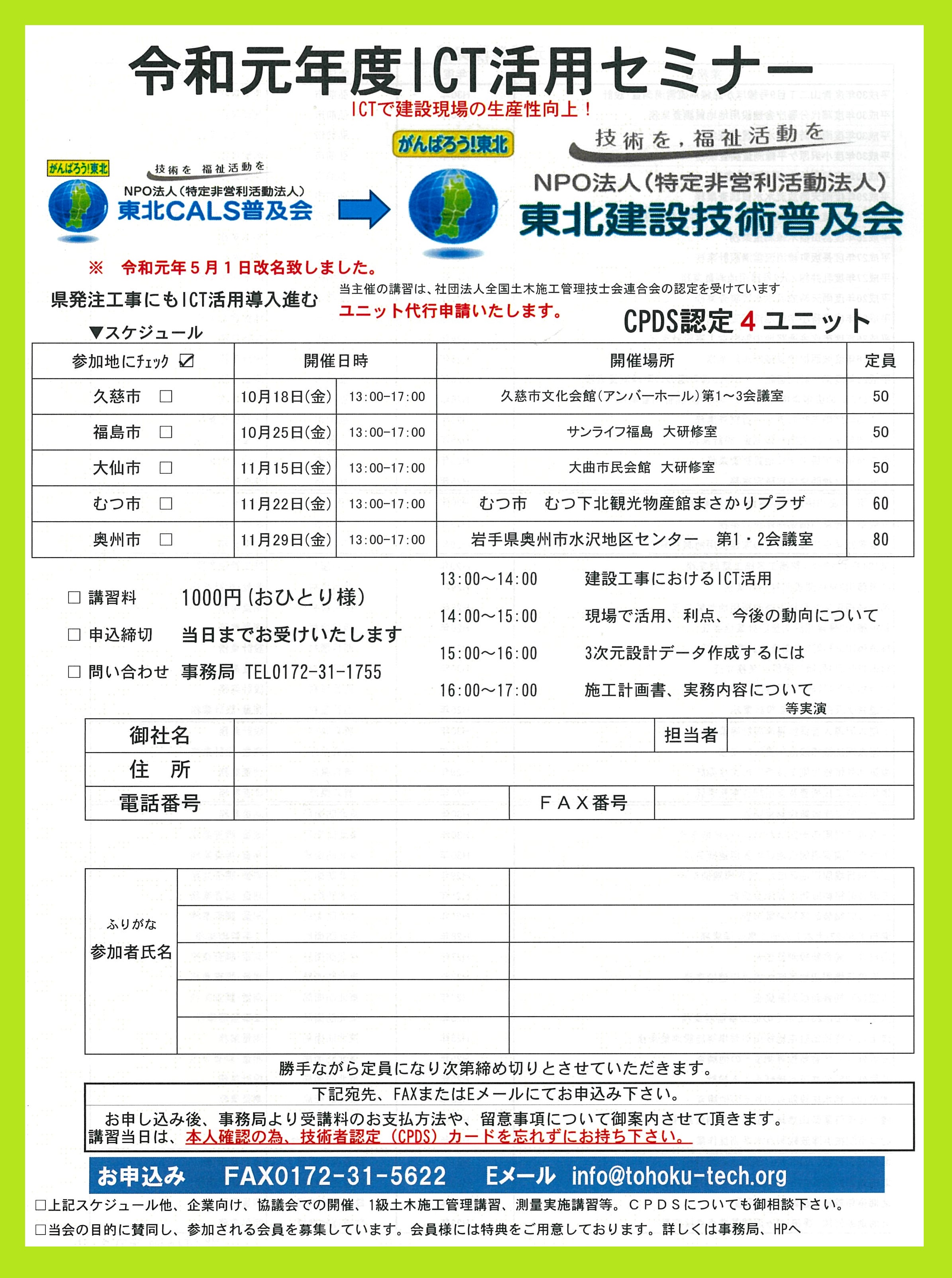 当法人では、CIM(3次元モデル)の運用やi-Constructionの導入など、東北地方における最新の建設技術の普及・発展に寄与することを目的に活動しています。