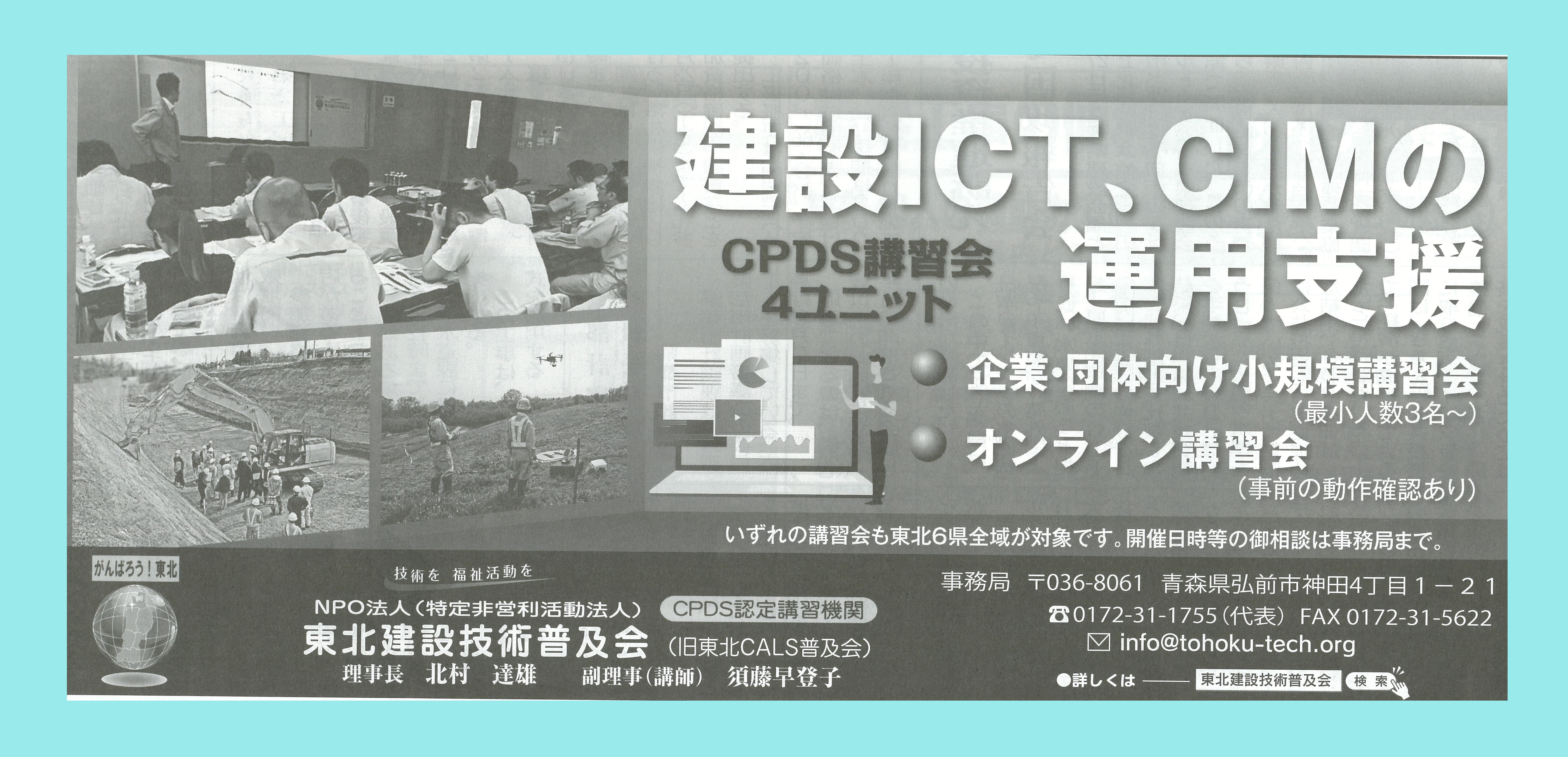 オンラインセミナー CPDS更新 2020.09.05 東北建設技術普及会 オンラインセミナー開催 CPDS 4ユニット ドローン レーザースキャナー 3次元計測 電子納品 小黒板情報の電子化 工事情報共有システム ASP BIM/CIM 事務局までお問合せください NPO法人東北建設技術普及会 0172-31-1755 info@touhoku-tech.org