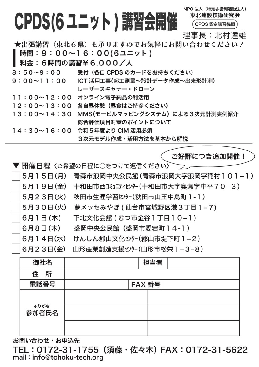5月30日火曜日、仙台市夢メッセ 会議室で講習会を追加開催決定しています