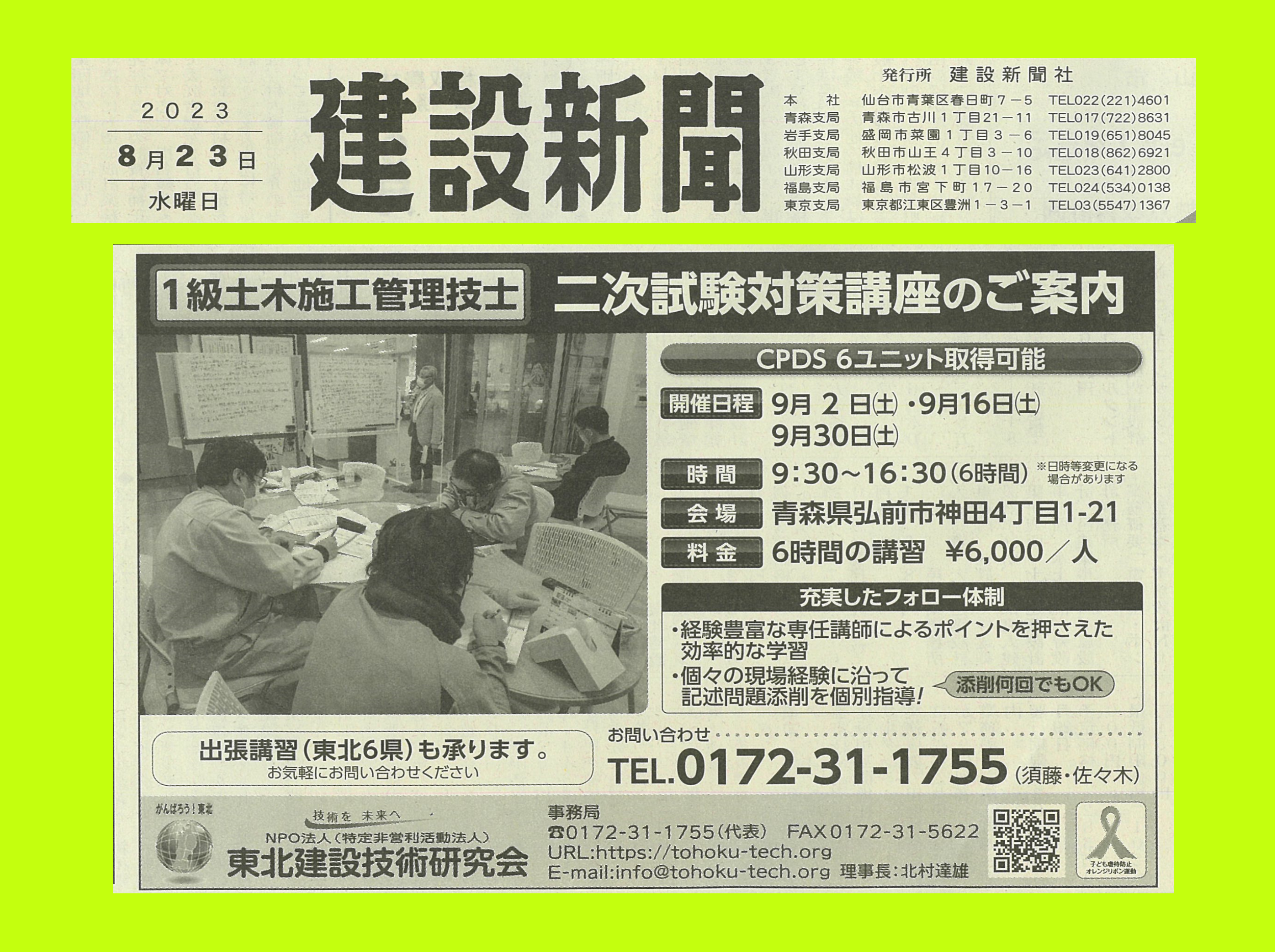 本日、建設新聞様に講習会の広告を掲載していただきました。