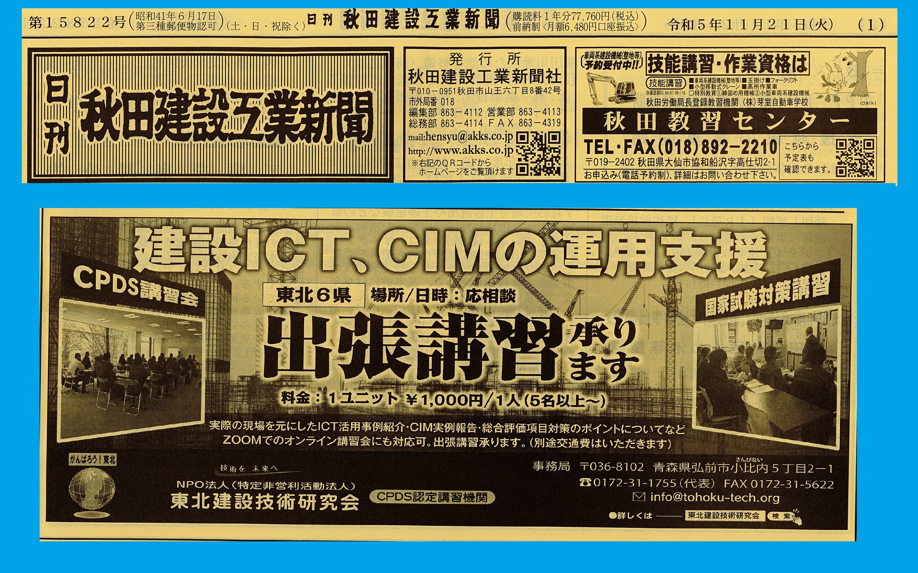 日刊秋田建設工業さんに掲載頂きました更新 2023.11.28 こんにちは、東北建設技術研究所です(^^)/ 今年も、あと1ヶ月と少しになりました💦 年々、1年があっという間に過ぎるなと感じます(^^;) 今年もあと1ヶ月、事故や体調に気を付けてお過ごしください(*・ω・)/ さて、日刊秋田建設工業新聞さんに掲載頂きました!! 掲載、ありがとうございます♪♪