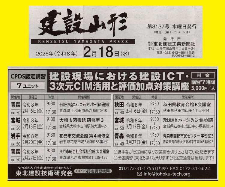 建設山形様、日刊秋田建設工業新聞様、建設新聞様、掲載ありがとうございます。