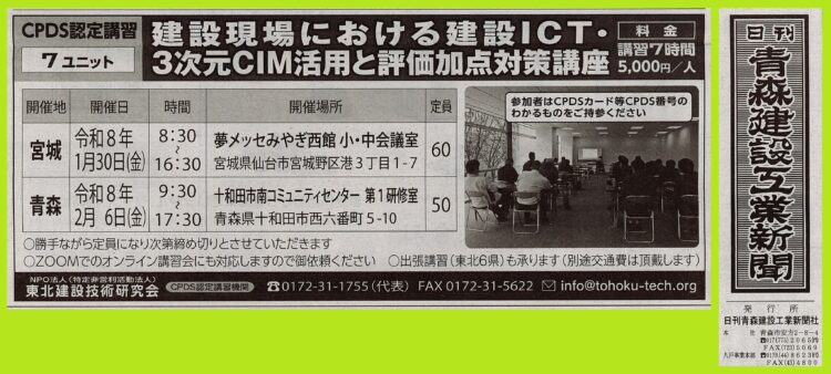 こんにちは、東北建設技術研究会です! 日刊建設青森様にCPDS認定講習会の広告を掲載いただきましたので、ご紹介いたします! 日刊建設青森様、掲載ありがとうございます🎵 ⇩詳細 ... 続きを読む