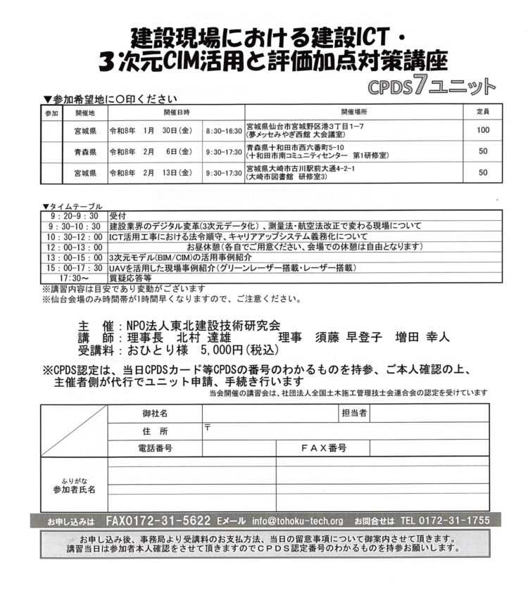 こんにちは、東北建設技術研究会です⭐ CPDS認定講習会、令和8年の日程が追加となりました!! 2月13日(金)大崎会場が追加となりました!! また、仙台会場も小・中会議室か ... 続きを読む