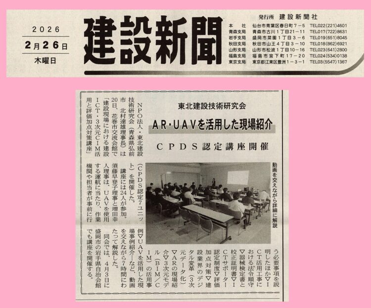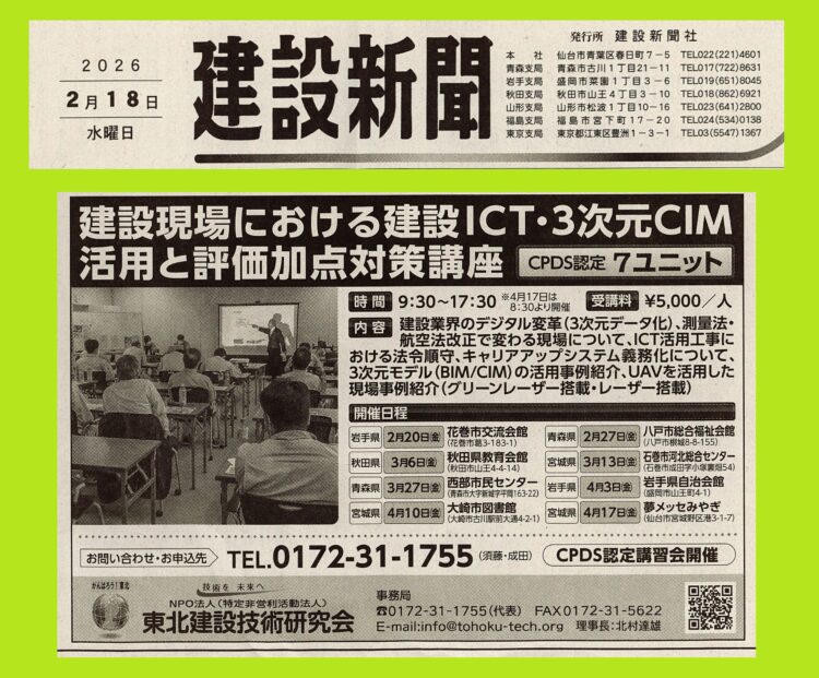 こんにちは、東北建設技術研究会です😀 2月6日(金)十和田市で開催されたCPDS認定講習会の様子が新聞に掲載されましたので、ご紹介いたします。 建設新聞様、掲載ありがとうございます。 ... 続きを読む